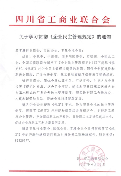 四川省工商业联合会关于学习贯彻《企业民主管理规定》的通知