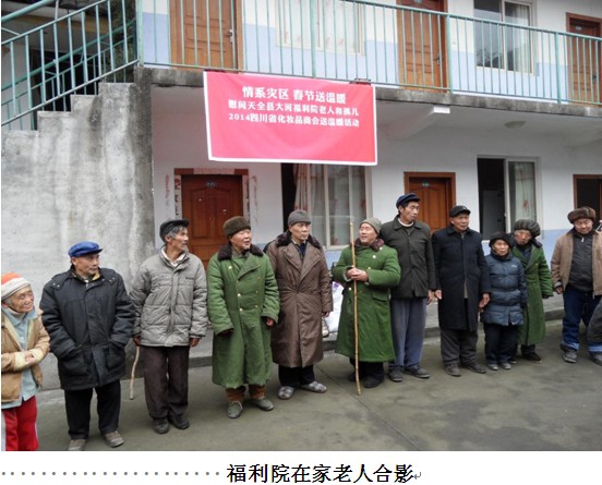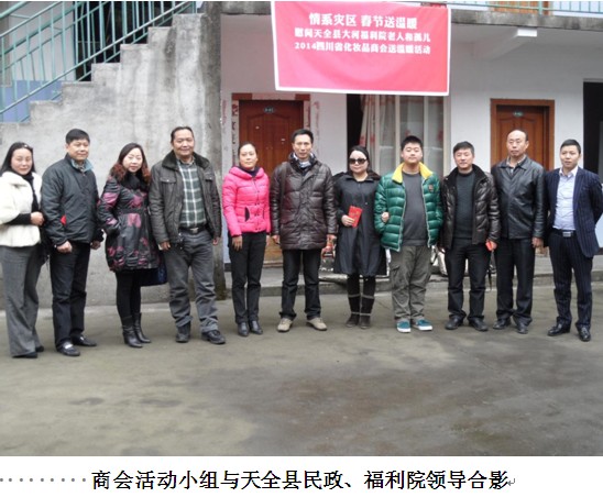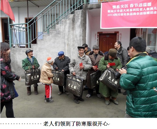长期以来,四川省化妆品协会在做好本行业工作之余,都不忘尽己所能,推广公益事业,为社会多送出一份温暖。为了让420受灾地区的老人们过一个开心的春节。2014年1月10日,商会常务副会长陈树根,副会长王英、涂英、汪丽君、朱贵林、文斌,秘书长付前友,组成了送温暖活动小组,在天全县民政局、残联领导的带领下,把四川省化妆品商会及全川化妆品行业的真情和慰问,送到了420地震重灾区天全县大河福利院。