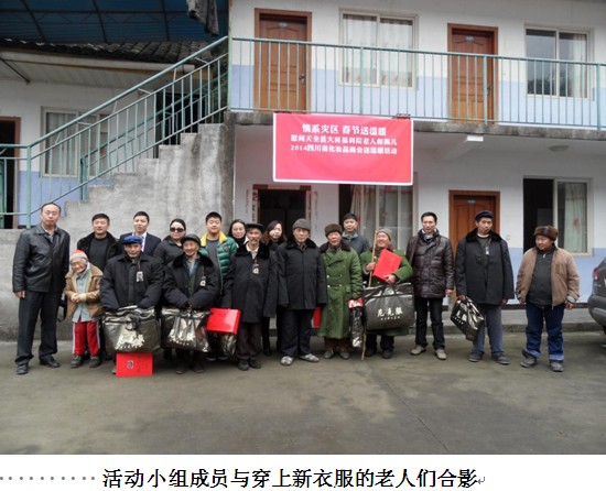 大河福利院原有30名老人和11名孤儿,地震过后,现只有18位老人和6名孤儿。在政府的妥善安置下,孤儿们都已入学,6名生病的老人也在医院接受治疗。活动小组给老人们发放了人均约950元防寒衣服、青油、洗衣粉及红包。老人们非常开心,笑逐颜开地表达着四川省化妆品商会活动小组的谢意,对各位老板生意兴隆的祝福。