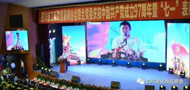 今年7月1日是中国共产党成立97周年,带领亿万人民走过40年改革开放宏伟征程,推动中国特色社会主义进入新时代,让一个曾经历经风雨的国家走近世界舞台中央,让一个饱经磨难的民族接近复兴梦想…… 连日来,各地组织开展形式多样的活动迎接建党97周年,激励广大党员干部群众永葆共产党人政治本色,不忘初心,砥砺前行。 为庆祝建党97周年,6月29日,四川省工商联直属商协会联合党委在国家检察官学院四川分院新华宾馆会议中心召开庆祝中国共产党成立97周年暨“七一”表彰大会。四川省委两新工委、省委统战部、省市工商联等领导出席,联合党委下属各商会支部及部分民营企业支部共300余人参加会议。 ▲省工商联党组成员、副主席、联合党委书记孙宁 四川省工商联筹办此会,借此弘扬党的正能量,唱响国家主旋律,筑牢“不忘创业初心、接力改革伟业”的思想共识,积极营造良好的党建工作氛围,整体推进直属商协会党的支部建设。 在众多联合党委下属各商会支部中,四川省化妆品商会也积极响应号召,为此次活动全新编排一个节目——《党啊!我想对您说》。商会选派成都迷艾化妆品有限公司,四川省化妆品商会副会长高一铷女士代表组织安排此节目,她不辞劳苦、尽职尽责的在短短五天时间内带领团队8为成员共同努力,从编排到音乐再到一次又一次的反复练习精进,为此还特别邀请了具备专业歌唱水平原隆昌市宣传部长唐智部长来友情支持,最终在现场完美呈现。 ▲《党啊!我想对您说》表演现场关注丨省化妆品商会积极参与省工商联庆祝建党97周年文艺汇演